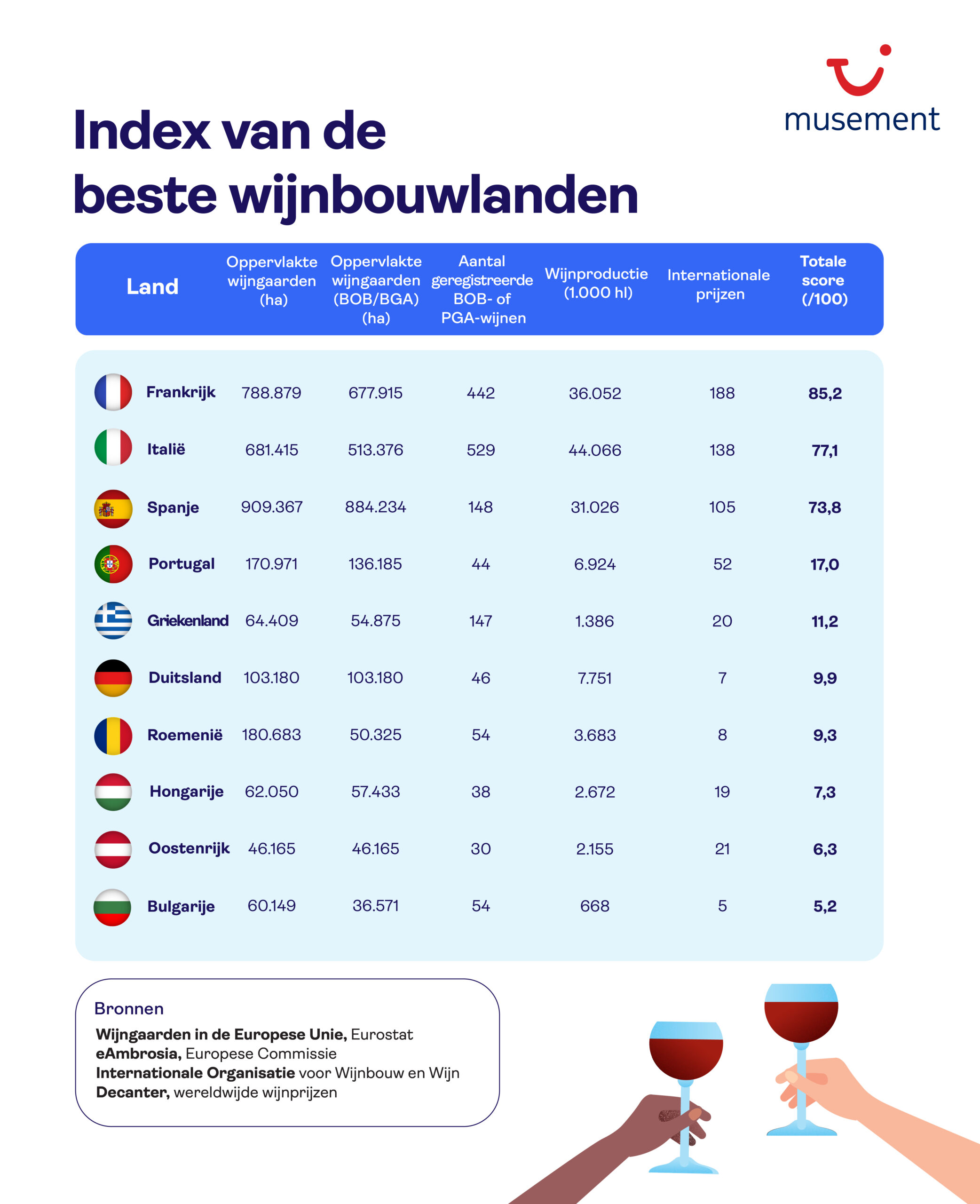 *Methodologie: alle lidstaten van de Europese Unie met een minimumoppervlakte van 500 ha wijngaarden werden geanalyseerd op basis van vijf categorieën. De totale score werd berekend aan de hand van een gewogen gemiddelde, waarbij aan elke variabele een ander gewicht werd toegekend: de oppervlakte aan wijngaarden heeft een weging van 20%, de oppervlakte aan wijngaarden met een BOB/BGA 30%, het aantal wijnen met een BOB of BGA 20%, de wijnproductie 10% en de internationale prijzen 20%.